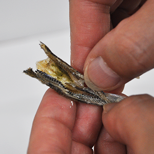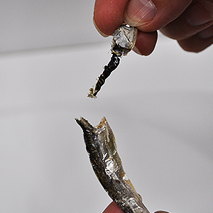 2.煮干しを半分に割り、腹わたを取り除きます