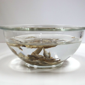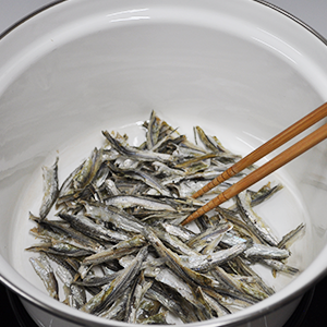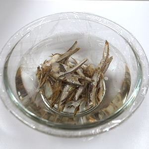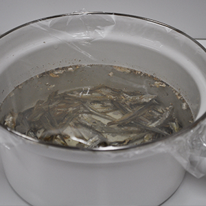 1.ボウルに煮干しと水を入れ、ラップをして、冷蔵庫で一晩保存します
