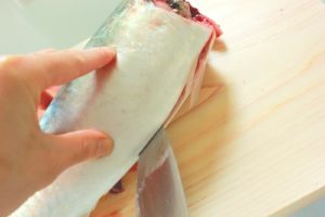 1,うろこやヌメリが付いている場合は、包丁を魚体に直角に当て、尾から頭にむかってこそげ落とす。