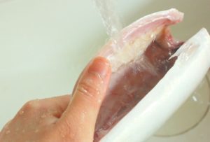 4,内臓をかき出したら水洗いをする。3.で取りきれなかった内臓や血合いをしっかり洗い落としておく。まな板に戻し、キッチンペーパーで水分をしっかり拭き取る。