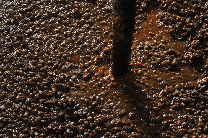 諸味の見た目は水分の多い味噌のような状態。人工的に温度調節できる環境で6ヵ月程度、四季の温度変化にゆだねる場合で1~2年熟成させます。職人は撹拌(かくはん)という作業で微生物の働きをサポートします。