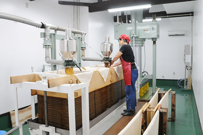 均等に何十段と重ねていく繊細な作業。しばらくすると醤油のしずくが滴り、よい香りが漂います。一気に搾りたい気持ちを抑えてゆっくりじっくりと。3日~7日程度時間をかける工程です。