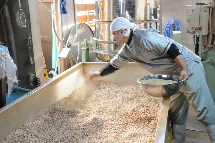 蒸した大豆と炒った小麦に種麹を加えて繁殖させます。麹菌が繁殖しやすい温度と湿度を調整することが職人の仕事。麹菌は自らが成長するために発する熱で死んでしまいます。温度が高すぎても低すぎてもだめで、定期的にほぐして空気を送り込みます。どのつくり手も真剣。