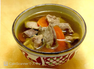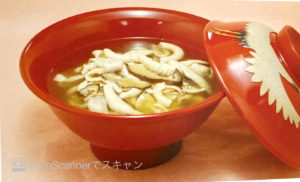 代表的な汁物・・・具だくさんのみそ汁、ゆし豆腐のお汁、アーサヌ汁、ムジヌ汁、グー汁、中身の吸い物、ソーキ骨のお汁、イカスミ汁、カチュー湯など。