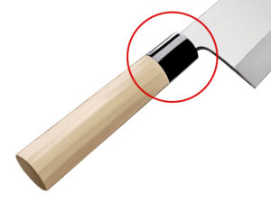 水牛の角は濡れるとよく締まる性質があり、柄が抜けにくくなる利点を持っています。そのため、良質な和包丁には水牛の角が使われていることが多いのです。ちなみに、ステンレスなどの金属で作られた口輪を「口金」(くちがね)と呼び、水牛の角の口輪には「角巻」(つのまき)という呼び名があります。